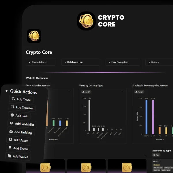 A professional‑grade Notion system for tracking crypto portfolios, research, and trading. See accounts, assets, performance, and risk clearly — and make decisions with confidence.
